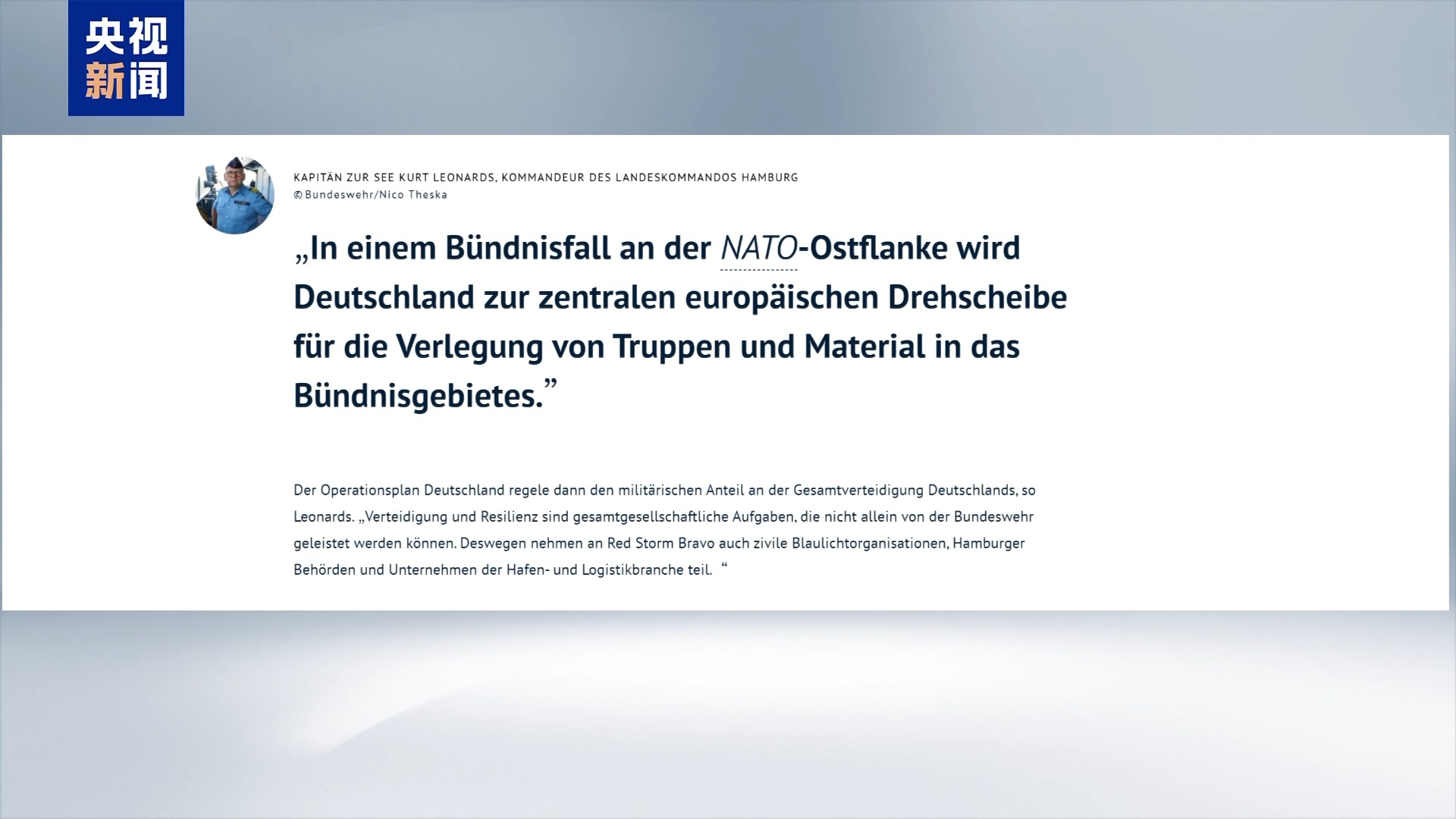 据德国联邦国防军介绍,此次军演的假想场景为,北约部队因波罗的海国家边境发生军事冲突而被派往东部。德国联邦国防军汉堡地区司令库尔特·伦纳德斯称,此次演习“基于北大西洋公约组织第四条的虚构场景”,其中波罗的海国家边境冲突升级,部队将通过汉堡港部署到俄罗斯边境。